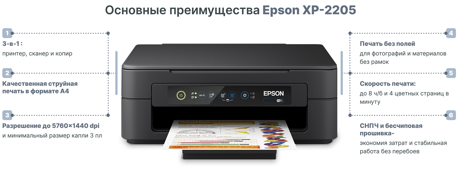 Epson Expression Home XP-2205 — это доступная модель, которая сочетает широкий функционал, экономичность и компактность.